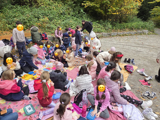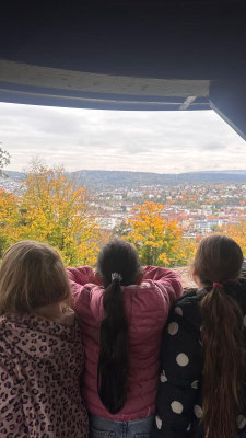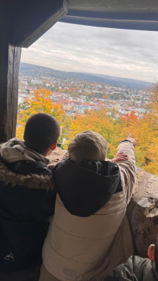 Kurz vor den Herbstferien machten wir, die Klassen 2a und 2b, eine Wanderung zum Hachelturm in Pforzheim. Der Weg dorthin dauerte etwa 45 Minuten und unterwegs mussten wir viele Treppen steigen. Als wir oben ankamen, waren wir ganz schön erschöpft. Deshalb machten wir eine Pause und ein Herbstpicknick. Es gab viele Leckereien und lustige Gruselmandarinen. Danach besichtigten wir den Hachelturm. Von oben konnten wir ganz Pforzheim sehen. Pforzheim von oben ist sehr beeindruckend!